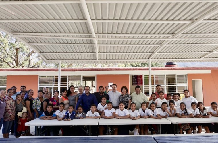 El presidente municipal de Manzanillo, Enrique García Pérez, entregó a los estudiantes de la escuela primaria “5 de Mayo”, 8 comedores y techumbre que cambiará la imagen del plantel, al dotar de un sitio adecuado para el consumo de alimentos a los niños.