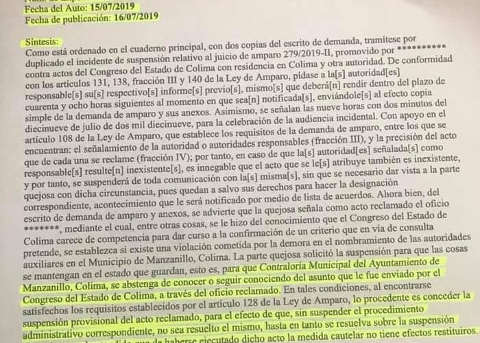 Después de haber presentado un amparo el Dr. Agustín Díaz Torrejón, mejor conocido como “el Abogado del pueblo” en contra del congreso del Estado de Colima, por no abrir un juicio político en contra de la presidenta municipal de Manzanillo, Griselda Martínez Martínez, por no respetar las elecciones de autoridades auxiliares pasadas, acaban de conceder la suspensión provisional el juzgado federal de distrito en Colima, con el expediente # 279/2019. Para que la contraloría del municipio de Manzanillo, no se pronuncie con relación a la sanción que les corresponde, por haber violado la Constitución del estado de Colima.