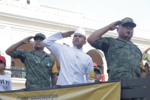 Posteriormente, el gobernador y las autoridades se trasladaron a Palacio de Gobierno para presenciar el desfile cívico militar, en el que participaron 41 contingentes, con 3 mil 937 participantes y 55 vehículos.