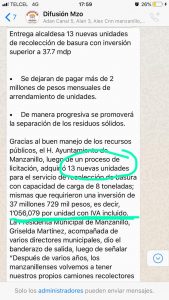 El día de hoy 14 de octubre por la tarde la alcaldesa de manzanillo Griselda Martínez Martínez, hizo entrega de 13 camiones nuevos para la recolección de basura, haciendo mención que en estas 13 unidades se gastaron 37 millones 329 mil pesos, en la compra total.