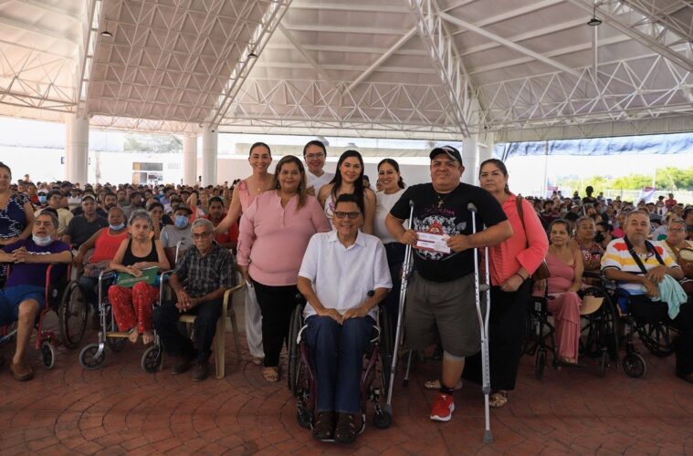 La gobernadora del estado de Colima, Indira Vizcaíno Silva, y la directora regional de Programas para el Bienestar, Ana Karen Hernández Aceves, entregaron este jueves tarjetas de la Pensión para el Bienestar de las Personas con Discapacidad, a 750 personas (716 de Manzanillo y 34 de Minatitlán) por más de 4 millones de pesos, recordando que, para este programa, tanto el Gobierno del Estado y el Gobierno de México aportan la misma cantidad de recurso económico.