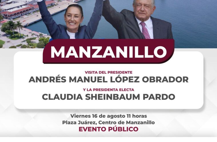 El presidente de México, Andrés Manuel López Obrador y la presidenta electa, Claudia Sheinbaum Pardo, estarán en el municipio de Manzanillo este viernes 16 de agosto, como parte de una visita oficial del mandatario federal al estado de Colima.