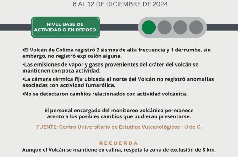 Del viernes 6 al jueves 12 de diciembre, el Centro Universitario de Estudios Vulcanológicos (CUEV) de la Universidad de Colima, contabilizó de forma manual dos sismos de alta frecuencia y un derrumbe, ninguno de ellos relacionado con actividad volcánica; descartó cambios relacionados con actividad volcánica, explosiones y/o anomalías térmicas asociadas con la actividad fumarólica.