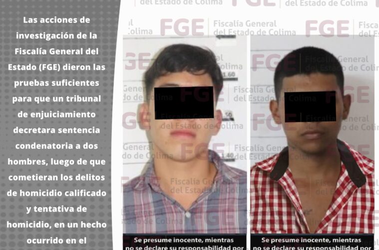 Las acciones de investigación de la Fiscalía General del Estado (FGE) dieron las pruebas suficientes para que un tribunal de enjuiciamiento decretara sentencia condenatoria a dos hombres, luego de que cometieran los delitos de homicidio calificado y tentativa de homicidio, en un hecho ocurrido en el municipio de Villa de Álvarez.